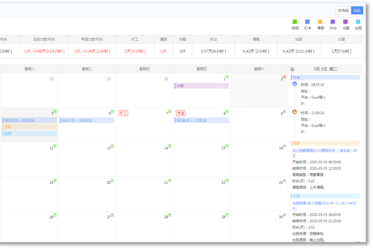通过OA系统时间线、日历两种模式清晰展示员工每天的考勤信息。不同色块区分打卡、请假、出差、外出、加班等不同考勤信息,时间有重叠时也能通过条状区域的交集清晰展示。