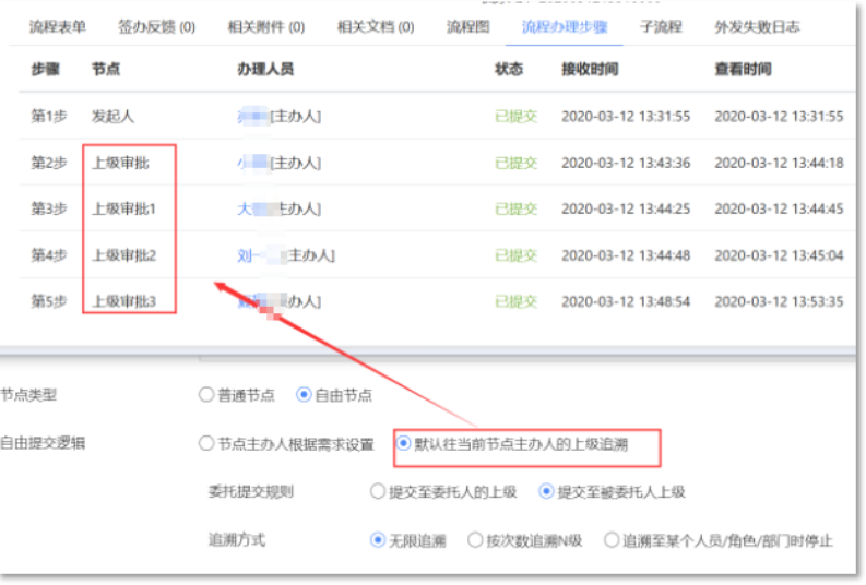 通过将直接上级设置为自由节点,流程自动根据上下级关系进行智能追溯、循环流转。自由节点可追溯无限上级审批、追溯至N级上级审批、或追溯至某种角色、某个用户、某个部门上级为止。
