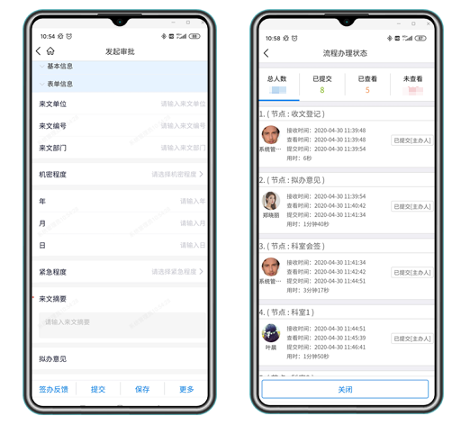 借助移动办公体系,通过手机便能随时查看收文进度,跟踪办理步骤。流程结束自动归档,并通过权限设置,保证公文信息安全。