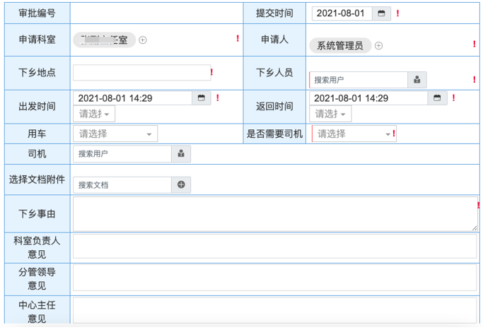 借助e-officeOA系统电子化流程体系,规范下乡审批。在下乡审批表中,领导可掌握下乡的基本情况,包括下乡地点、下乡人员、下乡事由、出发/返回时间等。