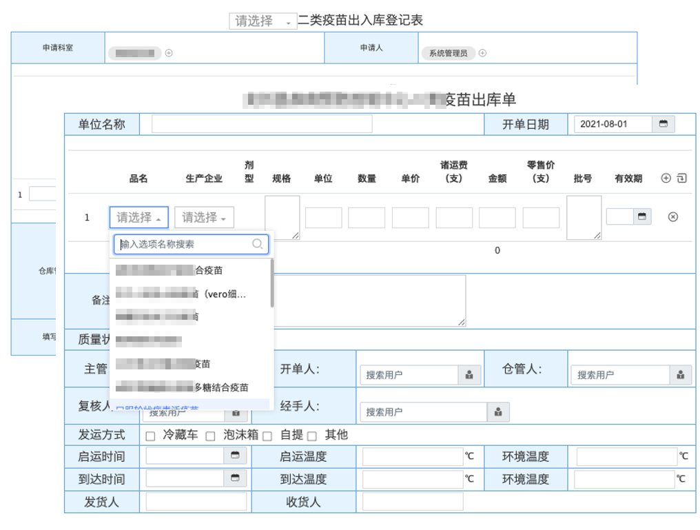 根据接种需求,疫苗的出入库实现流程化管控。发生出入库行为时,通过电子表单详细列明疫苗信息以及出入库日期,自动生成出入库记录。