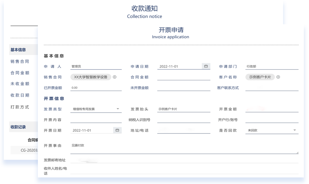 传统的合同管理难以跟进执行状态,客户打款/开票后,财务和业务两边的信息不对称:销售不清楚财务是否收到客户打款,财务不清楚款项由哪位客户打入、客户开票信息也不透明......