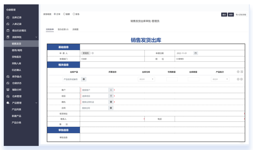 通过OA系统,无论是采购直发还是仓库发货,皆通过流程驱动,生成对应类型的出库记录。整个过程与库存打通,实现采购自动增库存、出库自动减库存,仓储状态由系统智能更新。